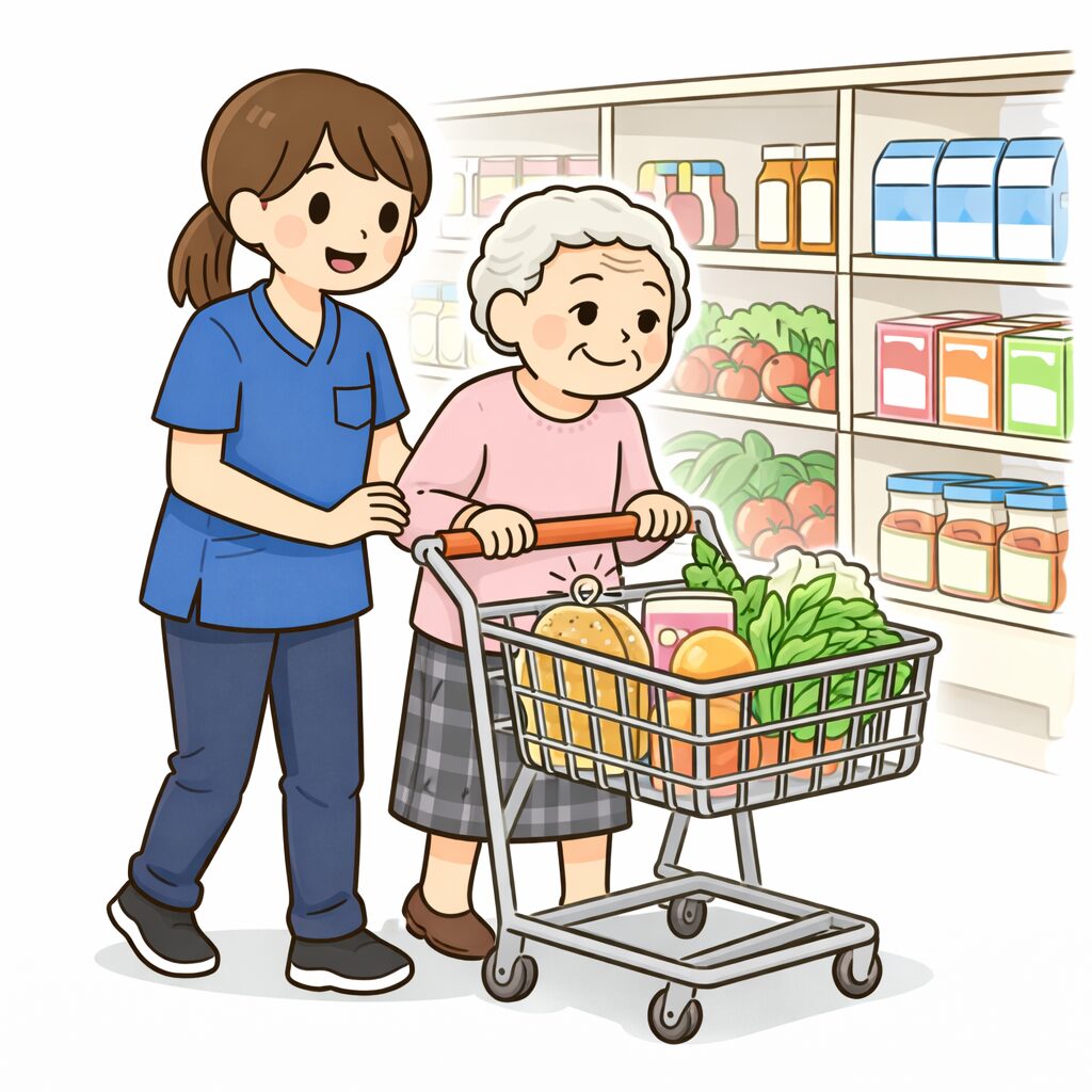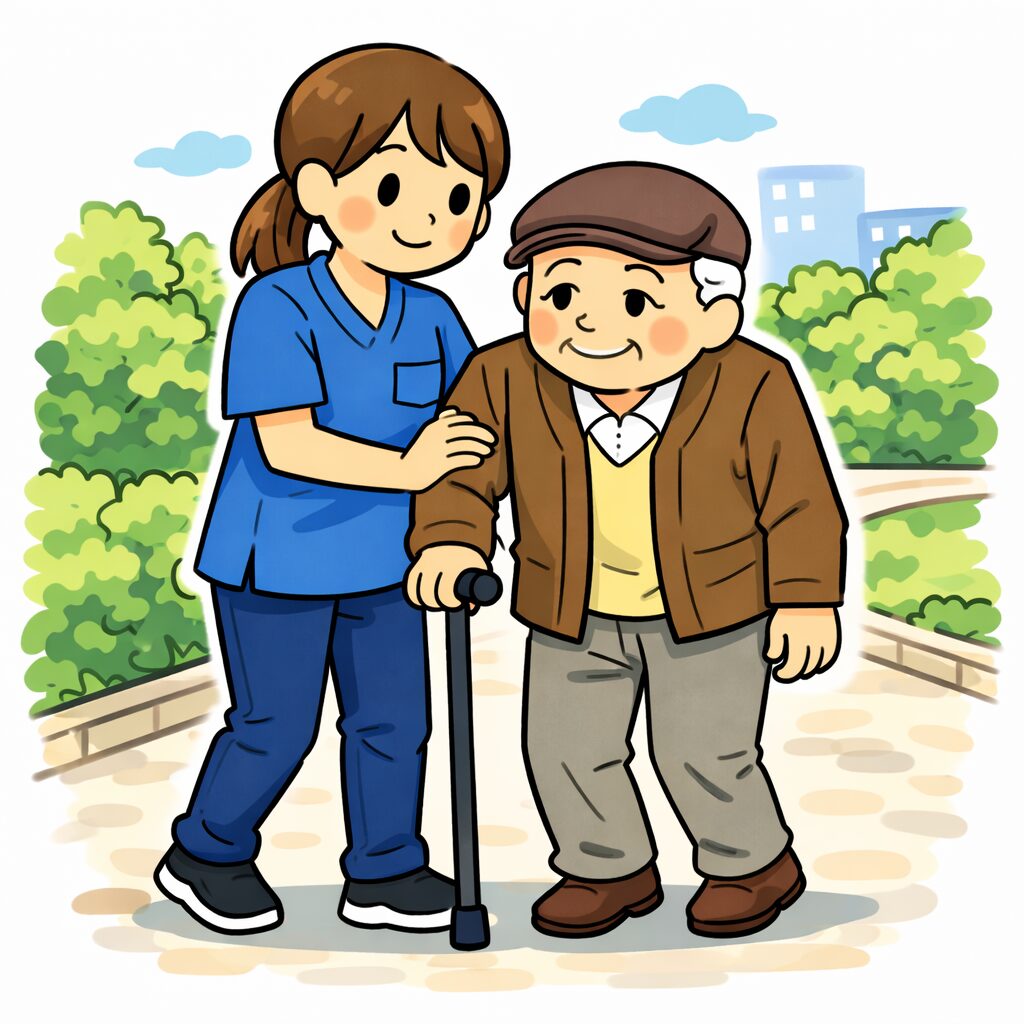 外出の付き添い・見守り・生活サポートを実施。状況により休憩や予定を調整します。