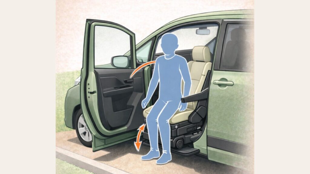 助手席は、座面が回転しながら少し前に傾く「ターンチルトシート」を採用。